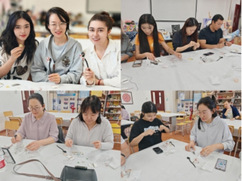 活动当天,分院教师与自己的交友学生热情参与,大家围坐在一起,共同学习制作传统发簪。在制作过程中,教师们不仅结合自身知识,细致讲述着传统工艺背后的历史与美学,还巧妙地将端午文化融入其中。原来在古代,人们会在端午这一天精心为自己或家人佩戴发簪,以此表达对美好生活的向往和对平安健康的祈愿。学生们认真倾听,积极实践,他们用灵巧的双手将一根根簪条、一片片珠翠慢慢组合,仿佛在串联起千年的文化脉络,活动现场氛围融洽热烈。