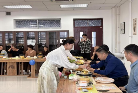 主持人陈思琪以"春回大地,万物复苏"的温暖开场,拉开了活动序幕。茶艺社学生带来的传统茶艺表演将活动推向首个高潮。伴着袅袅茶香,身着素雅茶服的表演者们以行云流水的温杯、置茶、冲泡动作,生动诠释了"茶中有礼,茶中见道"的文化精髓。在场教师在氤氲茶韵中品茗交流,感受着中华传统茶文化带来的心灵抚慰。