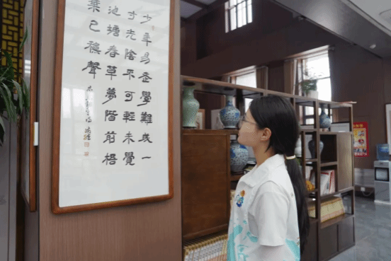 古色古香的建筑风格里,墨香与书香交织成厚重的文化气场。在 “琴棋书画”主题展区,实践团指导教师张玲驻足展陈前,为实践团成员娓娓道来古琴的悠远、围棋的哲思、书法的风骨、绘画的意境,将历史故事与中华优秀传统文化熔于一炉。“原来每一笔勾勒都藏着民族的智慧,每一处留白都写着文明的传承。”实践团成员深有感触,更坚定了“以语为媒、以文为桥”的信念——推广国家通用语言文字,不仅是沟通的需要,更是让中华优秀传统文化在祖国大地生生不息的使命。