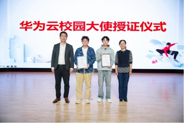 活动现场,王富超总经理结合当前 ICT 行业发展趋势与华为实践经验,围绕人才培养与技术创新展开分享。他引用习近平总书记关于人才培养的重要论述,以及任正非先生对技术创新的观点,深入剖析大模型时代背景下数字技能培育的核心价值与重要意义。学生们全程专注聆听,部分同学不时记录重点,其专业解读引发在场师生强烈共鸣。分享结束后,王谊副书记与王富超总经理共同为学院两位优秀学生代表颁发 “华为云校园大使” 官方荣誉证书,见证学生成长时刻,现场响起热烈掌声。