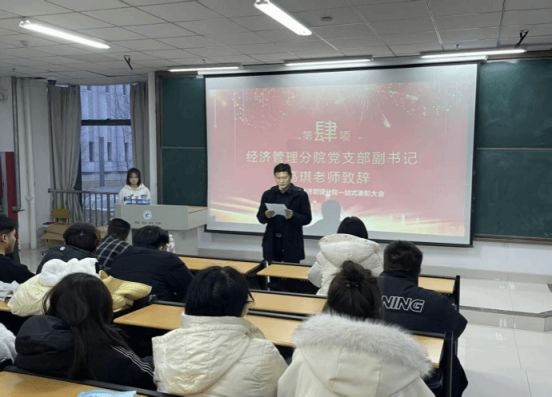 大会现场,学生代表登台发言,分享成长感悟与奋斗心得。经济管理分院党支部副书记高琪老师发表致辞,他充分肯定了过去一年分院各项工作取得的成果,寄语全体学子以先进典型为榜样,坚定信念、砥砺奋进。