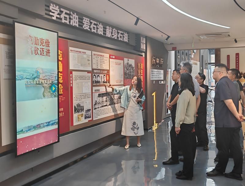 在历史厅,讲解员以“油龙献瑞,岁月流金”开篇,沿着乌鲁木齐明园开基立业、独山子奎屯河畔浴火重生、克拉玛依黑油山下壮志雄图的时间脉络,生动讲述了学院从艰苦创业到发展壮大的七十载征程。一幅幅老照片、一段段文字记载,承载着“一身油味儿、两肩担当”的克职院人的记忆。大家驻足聆听,目光不时落在墙上的老照片上,一边听,一边找——找自己认识的人,找自己经历过的事。
