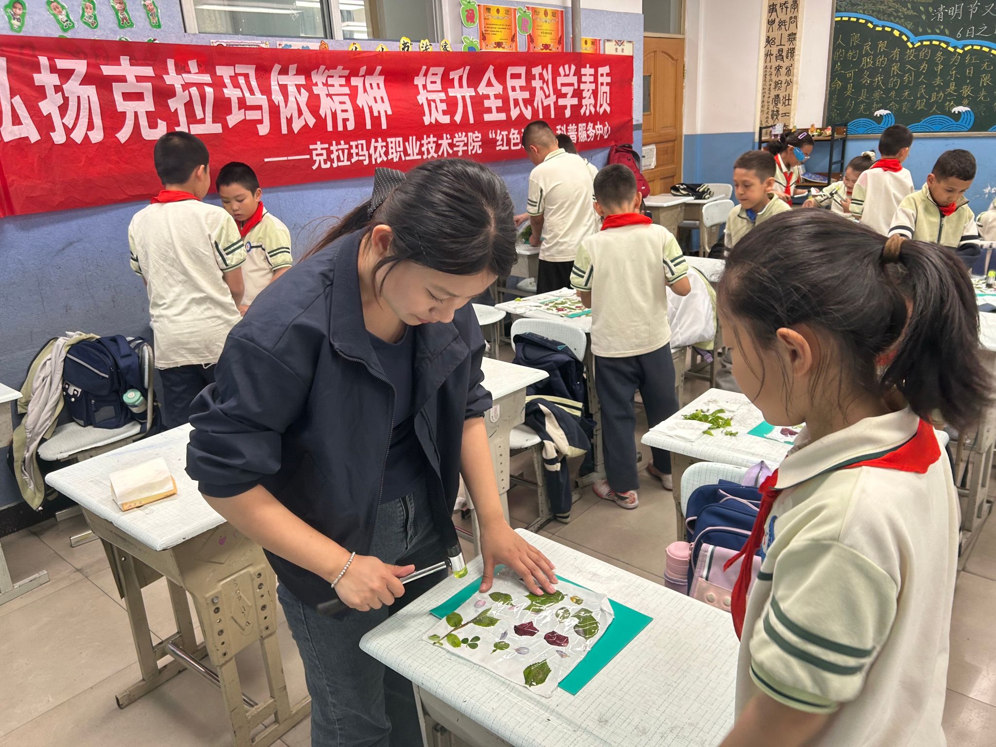 4月13日、14日和16日,三年级三个班分别开展了“植物拓染”手工科普实践活动,由大学生志愿者王明霞、张娴、马秀花依次进行主讲。104名学生动手采集植物、敲拓印染,沉浸式走进自然创作,感受科学与美学的巧妙融合,在趣味实践中锻炼动手能力、提升审美素养。
