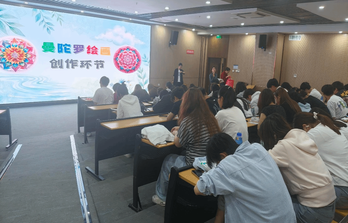 随后的曼陀罗绘画环节备受欢迎。在舒缓的轻音乐伴奏下,同学们拿起水彩笔,在圆形画纸上自由表达内心世界。色彩在纸面上流淌、交织,形成一幅幅独特的曼陀罗图案。“不要思考,只是感受,”姚鸿飞轻声提醒,“让手中的笔跟随你此刻的情绪自然移动。”