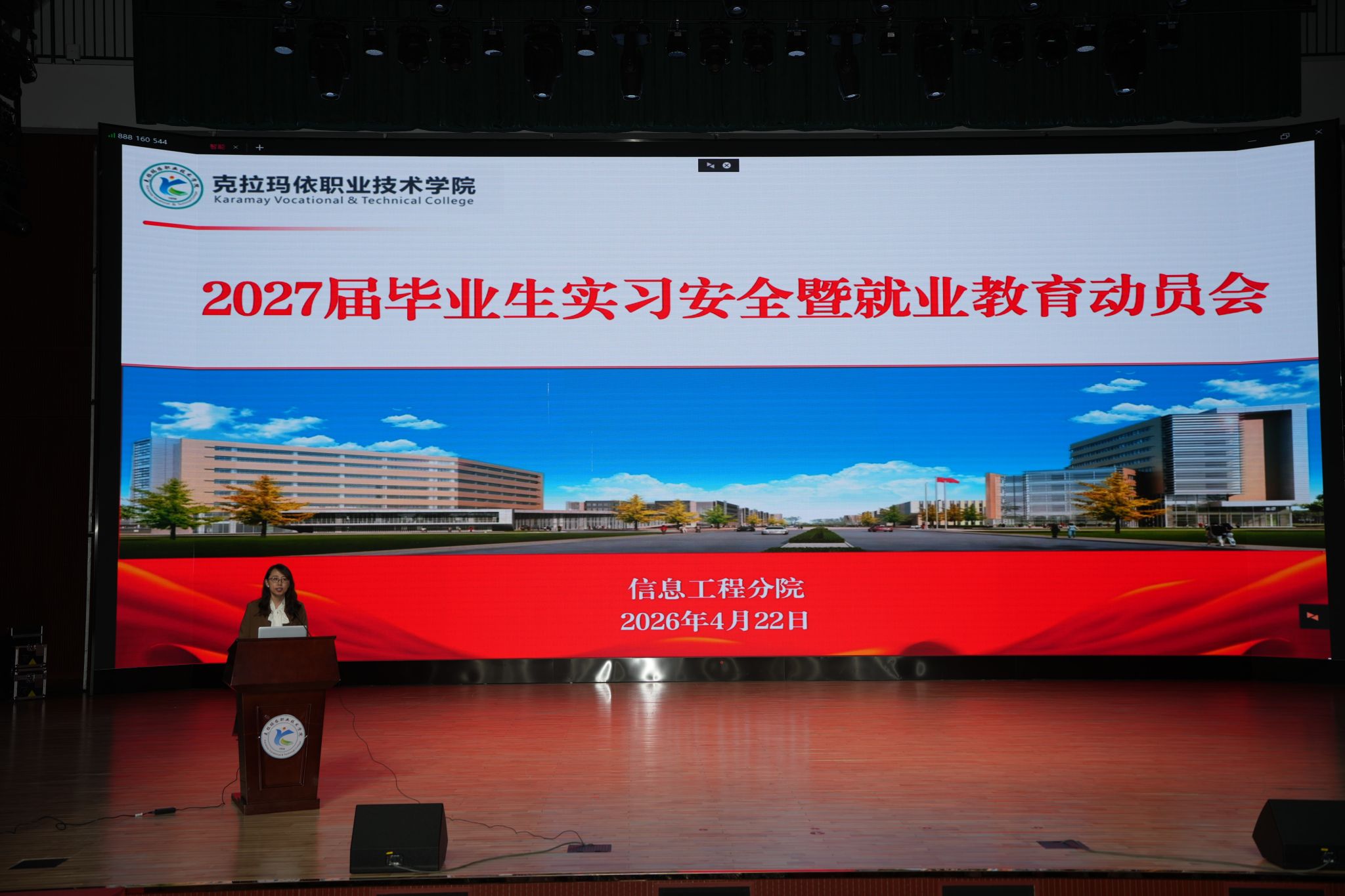 为扎实推进2027届毕业生岗位实习与就业工作,引导学生树立正确的实习安全观与就业择业观,4月22日,信息工程分院在大学生活动中心隆重召开2027届毕业生实习安全暨就业教育动员会。信息工程分院党支部书记田娟、副院长杨静,各教研室主任、全体辅导员、2027届毕业班班主任及2027届372名毕业生参加了本次大会。