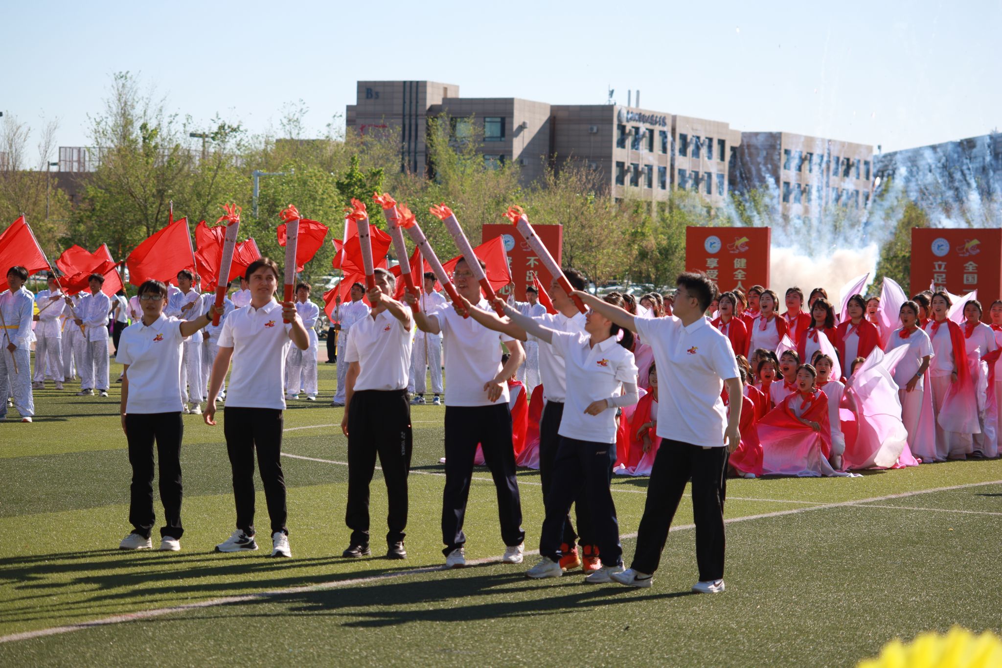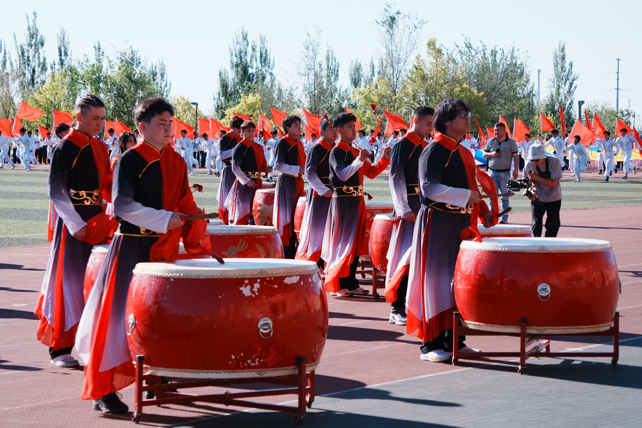 随着魏新院长郑重宣布“克拉玛依职业技术学院第45届田径运动会正式开幕”,团体操表演闪亮登场。数百名学生身着统一服装,踏着欢快整齐的节拍不断变换方阵,30面大鼓组成“鼓阵”,学生们紧握鼓锤,铿锵有力地敲打出七十载奋进的节拍,“1956”“2026”等字样在队列变换中清晰呈现,把青春朝气与对母校的祝福完美融合。灵动的舞步、昂扬的笑脸,尽显克职学子与母校同频共振的赤忱。七位教师代表手持火炬跑向操场中央。他们中既有深耕教坛的退休前辈与银龄教师,也有砥柱中流的教学骨干、勇攀高峰的青年博士与国赛骄子,更有跨越山海、携手相伴的留学生伙伴。众人一同点燃火炬花,礼炮随即齐鸣,彩烟腾空而起,掌声与欢呼声响彻整个操场,也点燃了克职人跨越七十载的奋斗热情。、