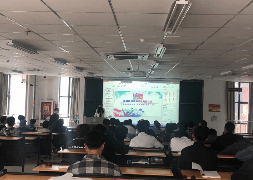 会议现场,新疆嘉润有限公司的招聘专员为参加招聘会的同学们详细介绍了公司的概况以及毕业生毕业后的工作环境、培训资源及提升通道等内容,又通过视频以及ppt演说从公司的运营,企业的前景等方面向同学们一一展示。