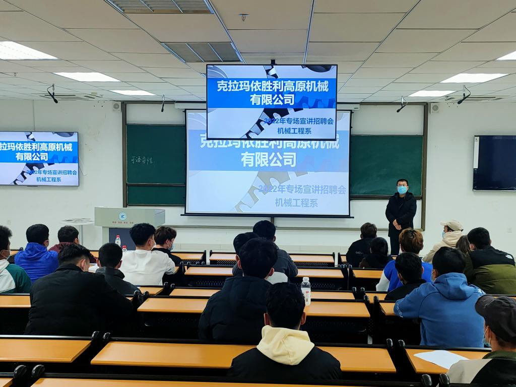2022年3月18日下午17点半,机械工程系与克拉玛依胜利高原机械有限公司合作,在克拉玛依职业技术学院C2-II-202开展了专场宣讲招聘会,机械工程系2023届毕业生与会。