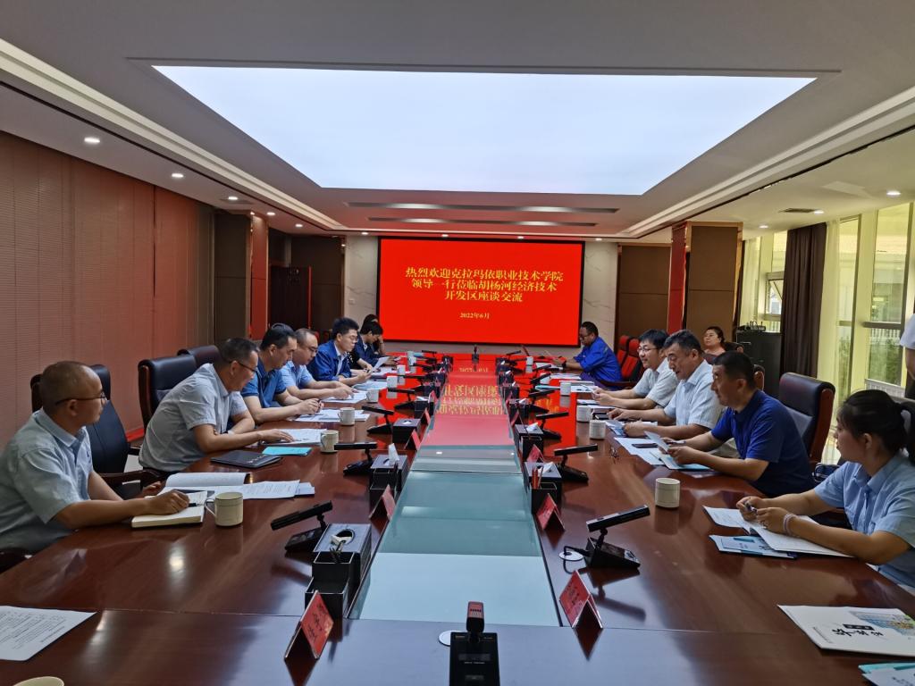 学院党委副书记、纪委书记扎克•司马义介绍了学院的发展情况,并就拓宽就业渠道、拓展就业岗位、开展实习实训、加强就业指导等方面与胡杨河经济技术开发区的领导及企业代表进行了深入交流,代表学院与新疆晶诺新能源产业发展有限公司、新疆广投桂东电子科技有限公司等企业签订了《产教融合校企合作协议》,与企业代表一起为克拉玛依职业技术学院产教融合实训基地进行了揭牌。