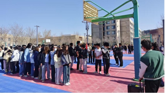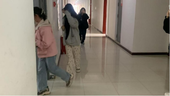 警报声响起后,各楼层疏散安全员在楼梯口引导,避免踩踏和混乱。整个过程紧张有序,最快班级用时3分钟撤离至安全地带,最后全体学生在宿舍楼B6楼前篮球场集合处集合。