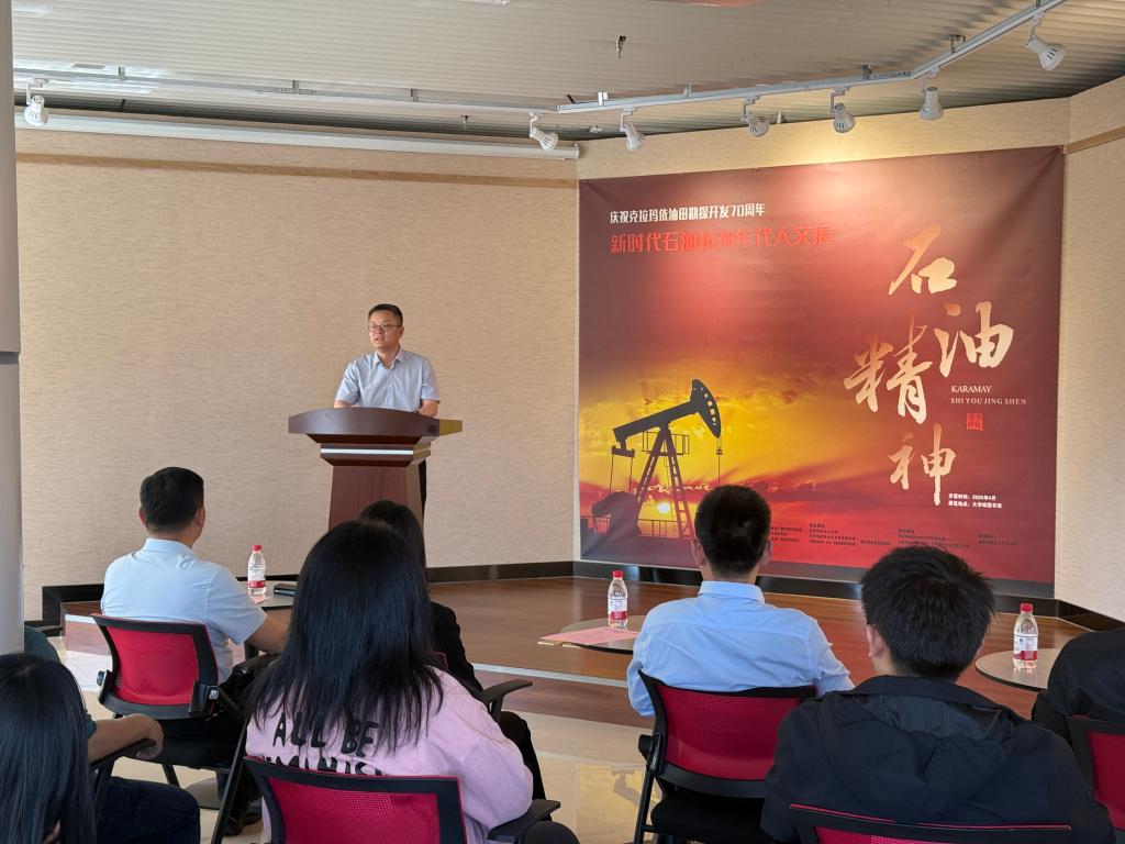 在开幕式中,学院党委书记魏新致辞,他表示石油精神是镌刻在克拉玛依血脉中的精神丰碑。70载勘探开发史中,“冰塔冰人”在零下40℃严寒守护油井的坚毅身影,杨拯陆为石油事业献出生命的赤诚,张云清、王延明等老一辈用青春浇灌“共和国石油长子”的壮举,共同铸就了“苦干实干、三老四严”的精神品格。学院始终将石油精神融入育人全过程,通过课堂讲授、实践教学、人文教育等,培育学生扎根边疆、建设祖国的使命担当。魏新书记在致辞中提到,将以此次巡展活动为契机,我院积极与石油大学共建“石油图文信息联盟馆”,开启资源、文化共建共享新里程。
