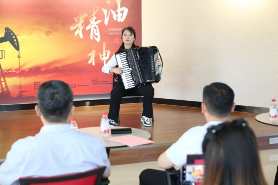 克拉玛依职业技术学院美育教师唐晶晶带来的手风琴独奏《我为祖国献石油》