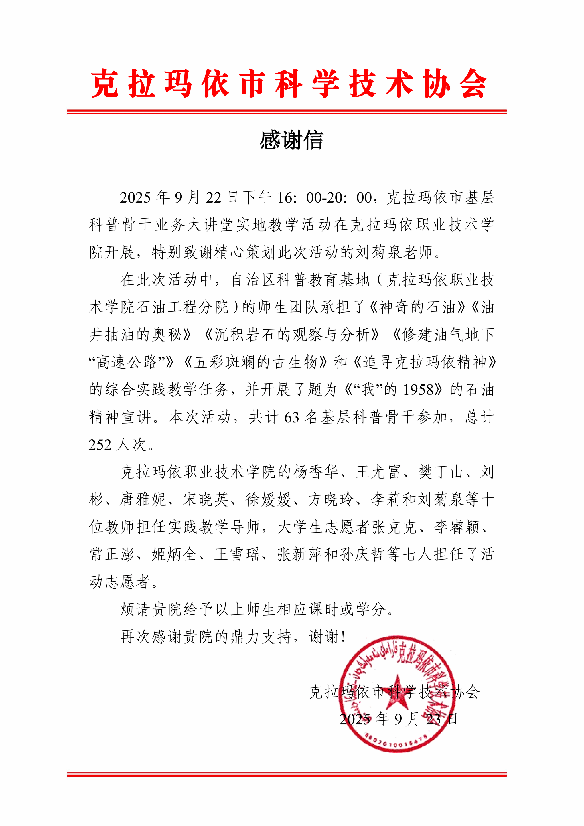 活动内容丰富多元,既有《神奇的石油》《极端天气与绿色低碳生活》《“我”的1958》等主题讲座,带领学生探索石油奥秘、树立生态环保理念、回望城市发展记忆;也有“鸡蛋‘游泳’”“小苏打‘生气’”“食盐水动力风车”等互动实践,让学生在动手操作中直观感受科学原理。累计惠及572人次,得到克拉玛依团市委及克拉玛依市第三中学等单位的一致好评。