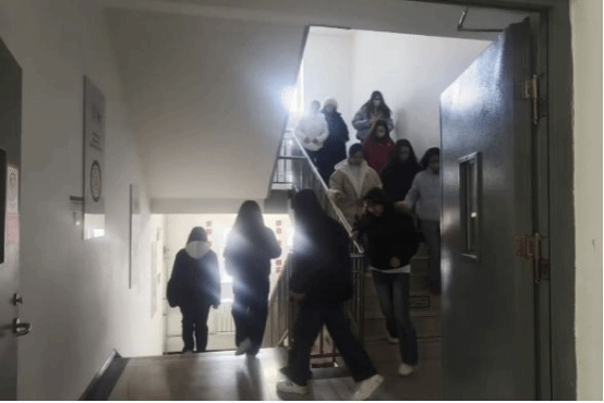 警报响起后,两栋宿舍楼学生在老师与楼层安全员引导下,沿既定路线迅速、有序撤离至B6楼前篮球场集合,过程紧张有序、配合默契。