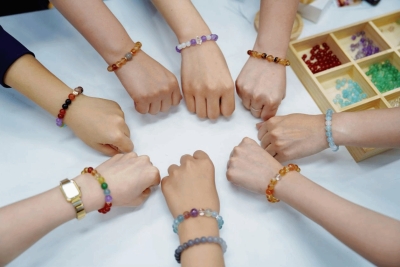 看着手腕上晶莹剔透、独一无二的作品,女教师的脸上洋溢着自豪与满足的笑容。这些手串不仅是一件件精美的饰品,更凝聚了大家对生活的热爱与对未来的美好期许。大家纷纷佩戴起亲手制作的手链合影留念,定格下这“晶”彩瞬间。