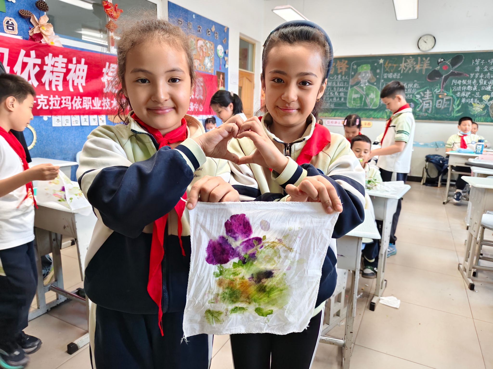 4月13日、14日和16日,三年级三个班分别开展了“植物拓染”手工科普实践活动,由大学生志愿者王明霞、张娴、马秀花依次进行主讲。104名学生动手采集植物、敲拓印染,沉浸式走进自然创作,感受科学与美学的巧妙融合,在趣味实践中锻炼动手能力、提升审美素养。