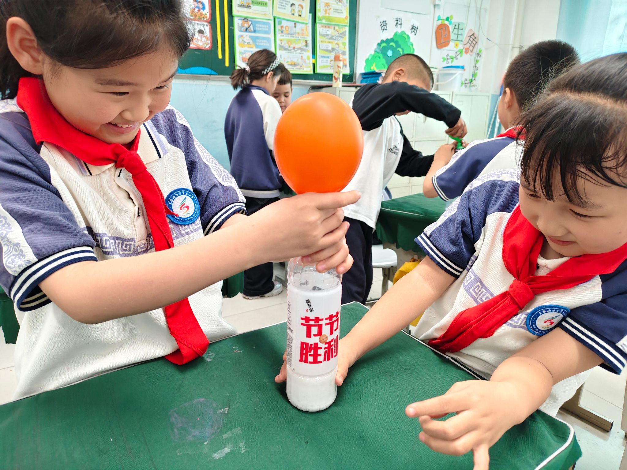 4月9日,来自采油2532班的大学生志愿者张自龙、杨佳琳、潘思绮为一、二年级3个班共123名学生开展了趣味实验《小苏打“生气”了!》,孩子们亲手混合小苏打和白醋,观察气泡产生和气球鼓起的现象,体验化学反应的乐趣。4月14日,潘思绮、杨佳琳为四年级83名学生带来实践课《小小盐水,大大能量》。学生们两人一组,用食盐水、铜片和锌片组装简易“盐水电池”,成功驱动小风扇转动,直观理解了电是怎么产生的,让抽象科学知识变得直观易懂。