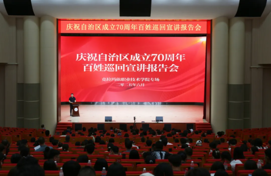 6月25日,庆祝新疆维吾尔自治区成立70周年百姓巡回宣讲团走进我院开展主题宣讲报告会。全院教职工、学生代表聆听了宣讲。 宣讲报告会现场5位来自全疆各地、各行业的基层宣讲员采用“宣讲+视频”的方式,以生动鲜活的语言、翔实丰富的事例,紧紧围绕铸牢中华民族共同体意识主线,从经济发展、民生改善、民族团结、教育文化等多个维度,讲述了各族人民团结奋斗、共建美好家园的感人故事,全方位、立体式展示了新疆维吾尔自治区成...