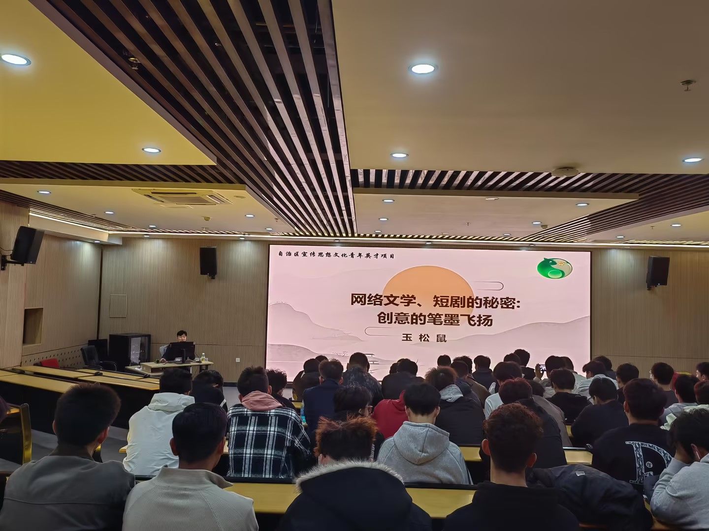 为深入推进“文化润疆”工作,丰富学生文化生活、提升学生文学创作素养与创新能力,11月3日,学院特邀中国作家协会会员、克拉玛依市政协常务委员、知名网络悬疑作家银珉(创作网名:玉松鼠)走进校园,开展题为《网络文学、短剧的秘密:创意的笔墨飞扬》的专题讲座,为师生们带来了一场兼具知识性与趣味性的文学盛宴。 讲座现场讲座现场座无虚席,氛围热烈。银珉以“什么是网络文学”为切入点,用生动通俗的语言打破学生对网络文学的认知壁垒,...